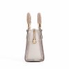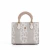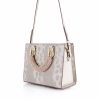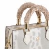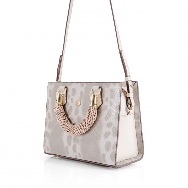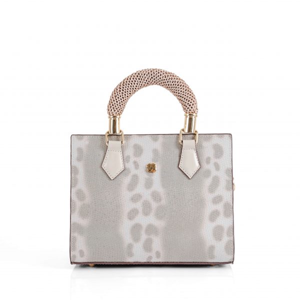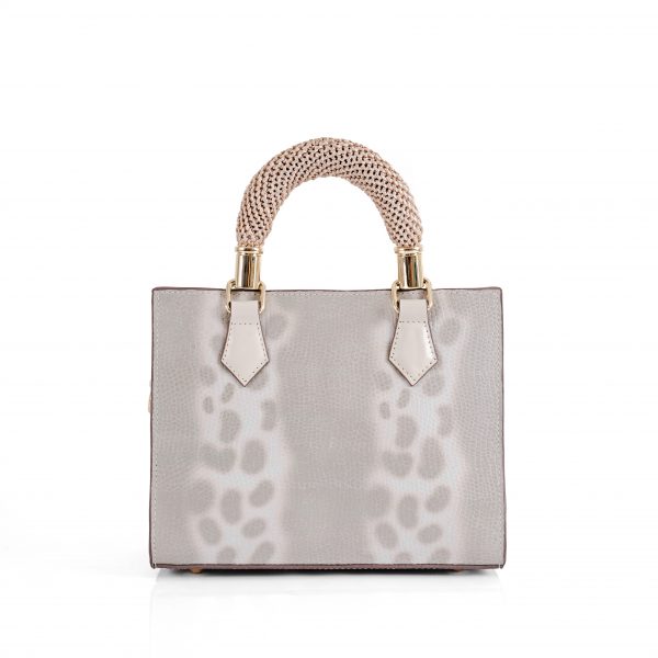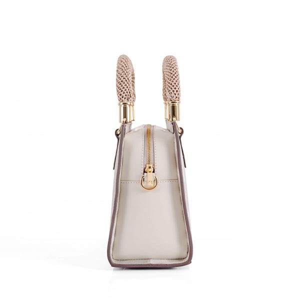 • Alças de mão fixas em crochê, na cor bege, e finalizadores metálicos;